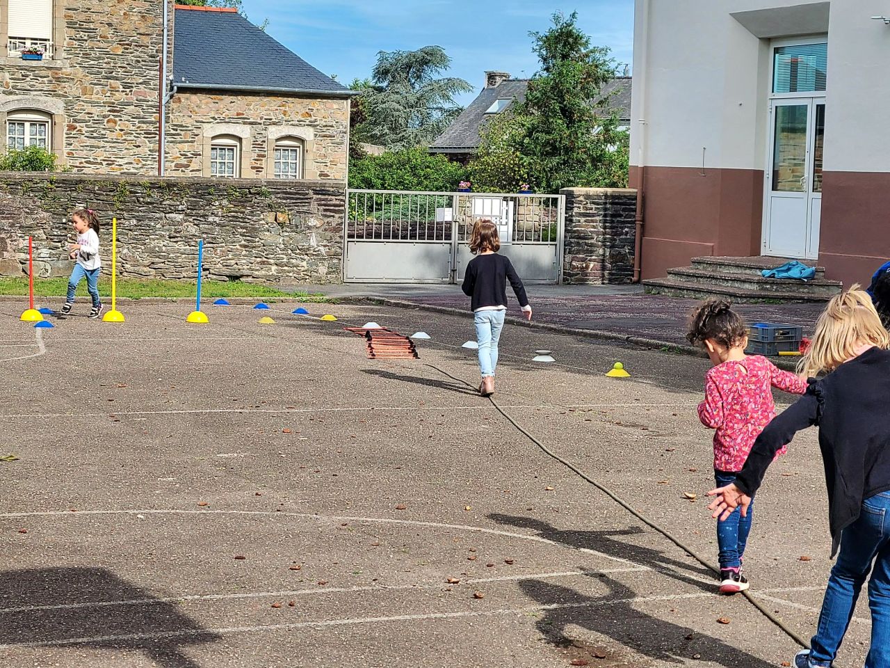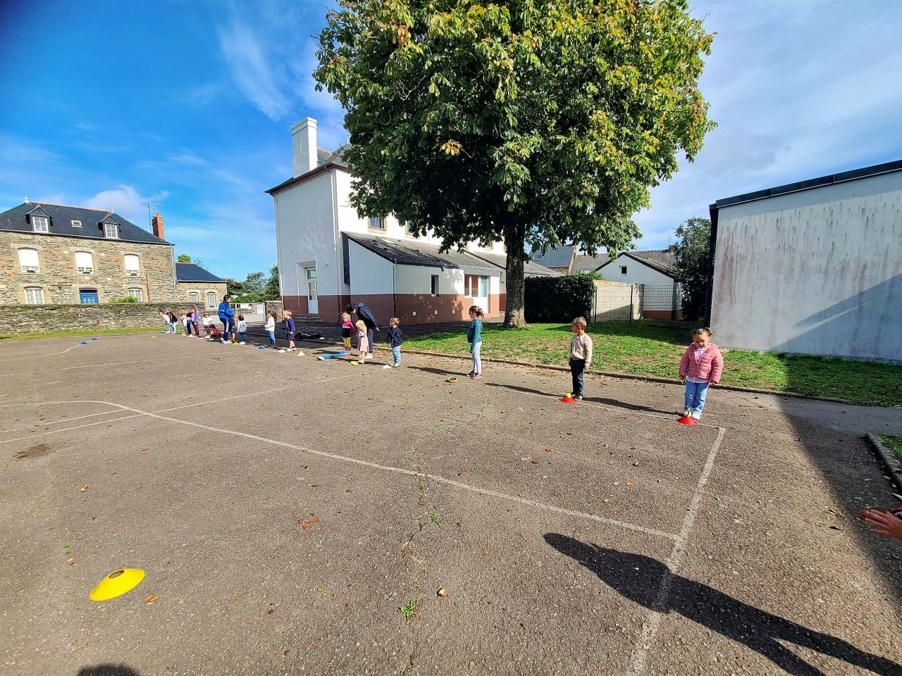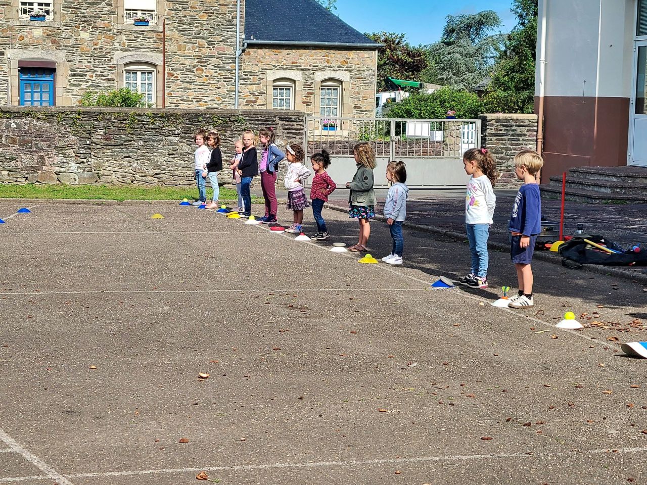 Tous les mardis matin, les élèves de maternelle CP vont sur la cour de la cantine pour faire de l'athlétisme avec Sylvie, intervenante de Ploërmel communauté.