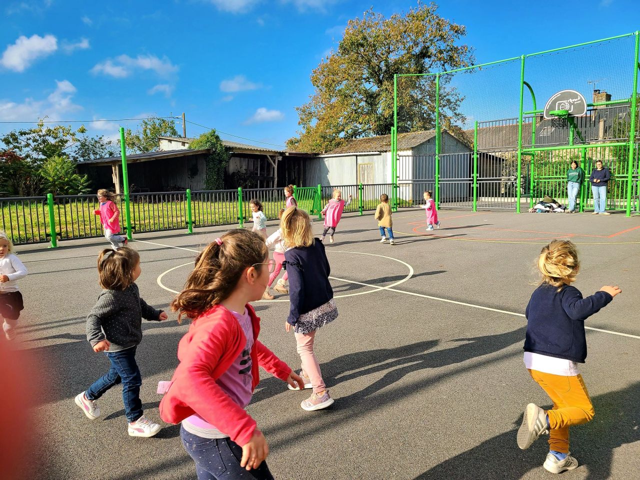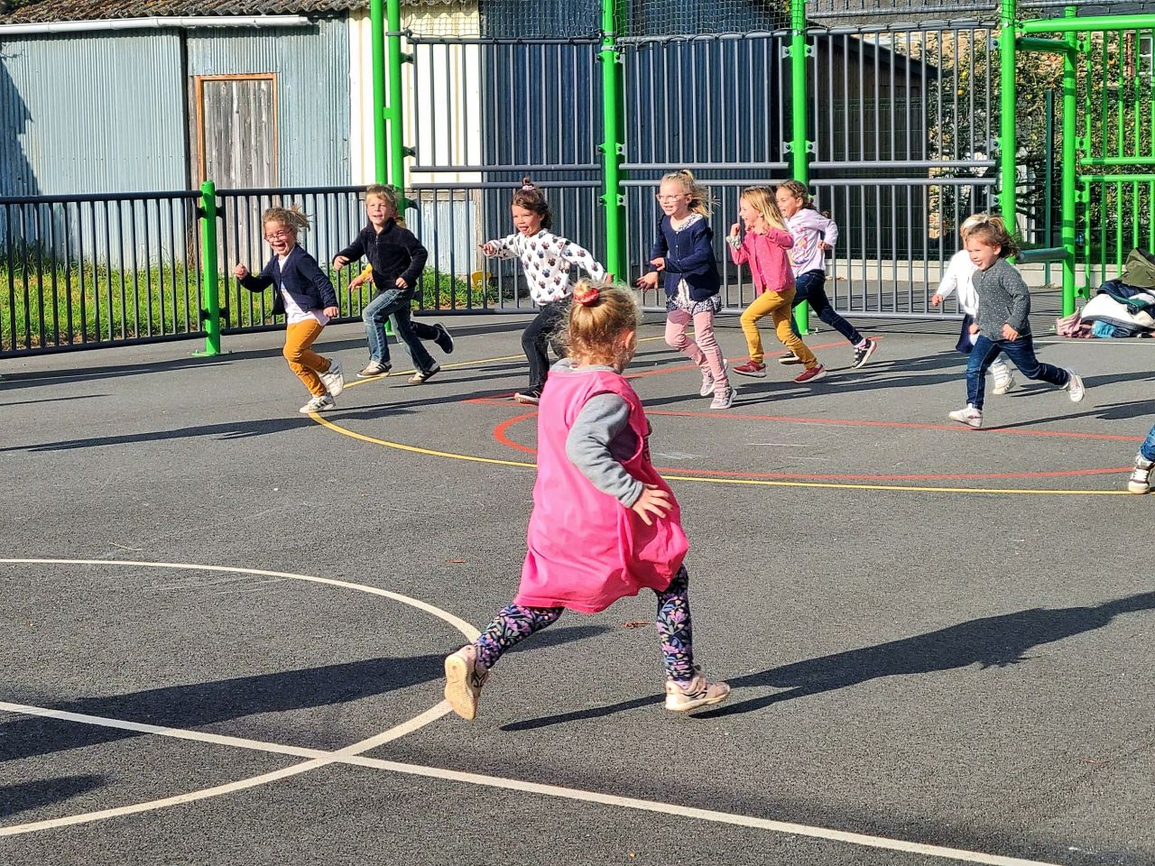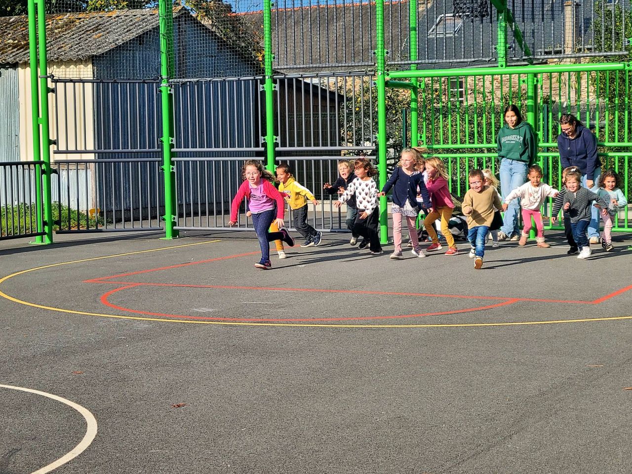Tous les mardis matin, les élèves de maternelle CP vont sur la cour de la cantine pour faire de l'athlétisme avec Sylvie, intervenante de Ploërmel communauté.