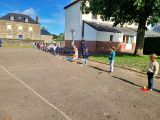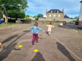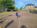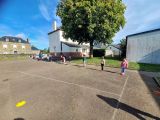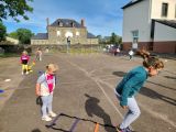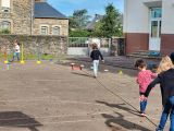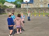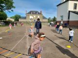 Tous les mardis matin, les élèves de maternelle CP vont sur la cour de la cantine pour faire de l'athlétisme avec Sylvie, intervenante de Ploërmel communauté.